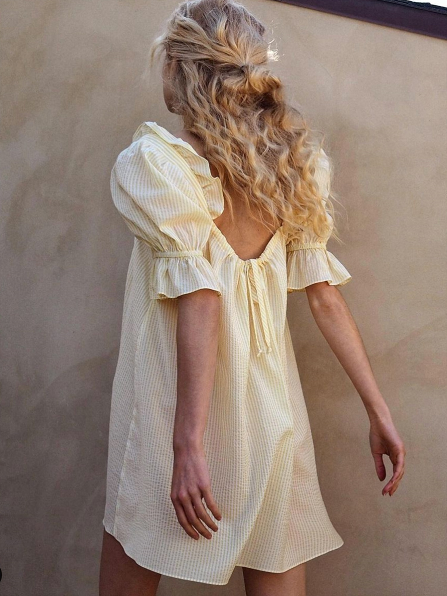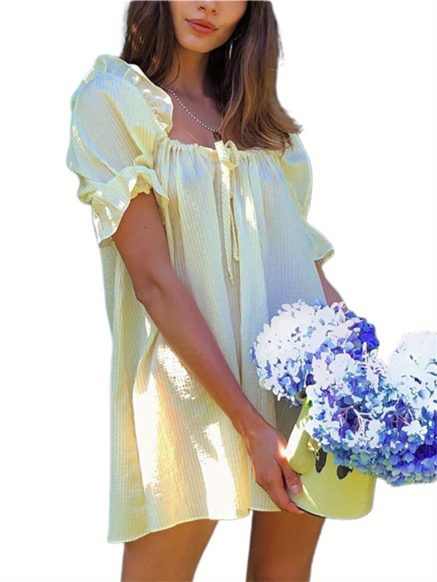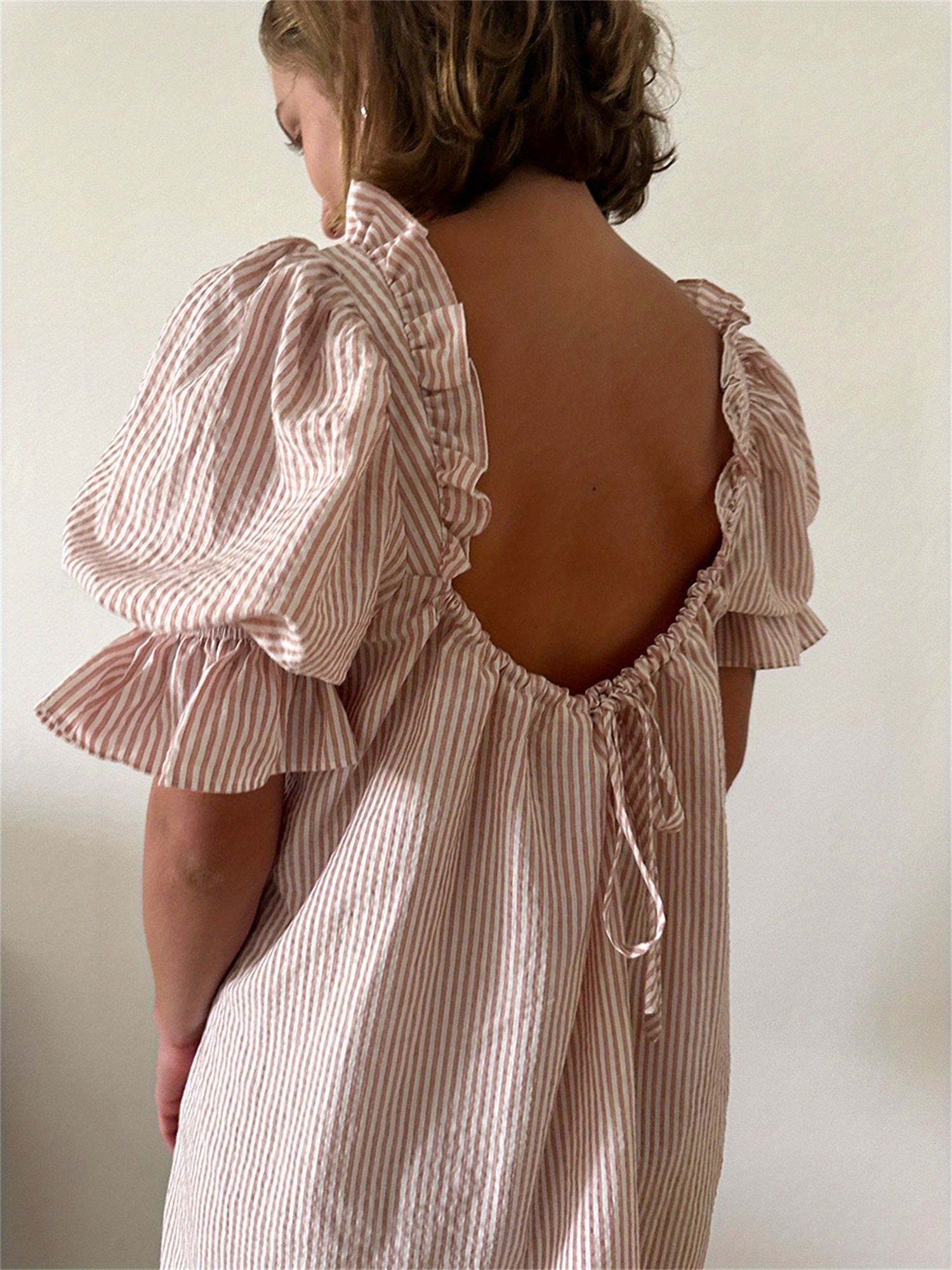 Womens Striped Babydoll Dress Loose Ruffle Trim Scoop Neck Puff Sleeve Backless Mini Dress for Daily Party Club