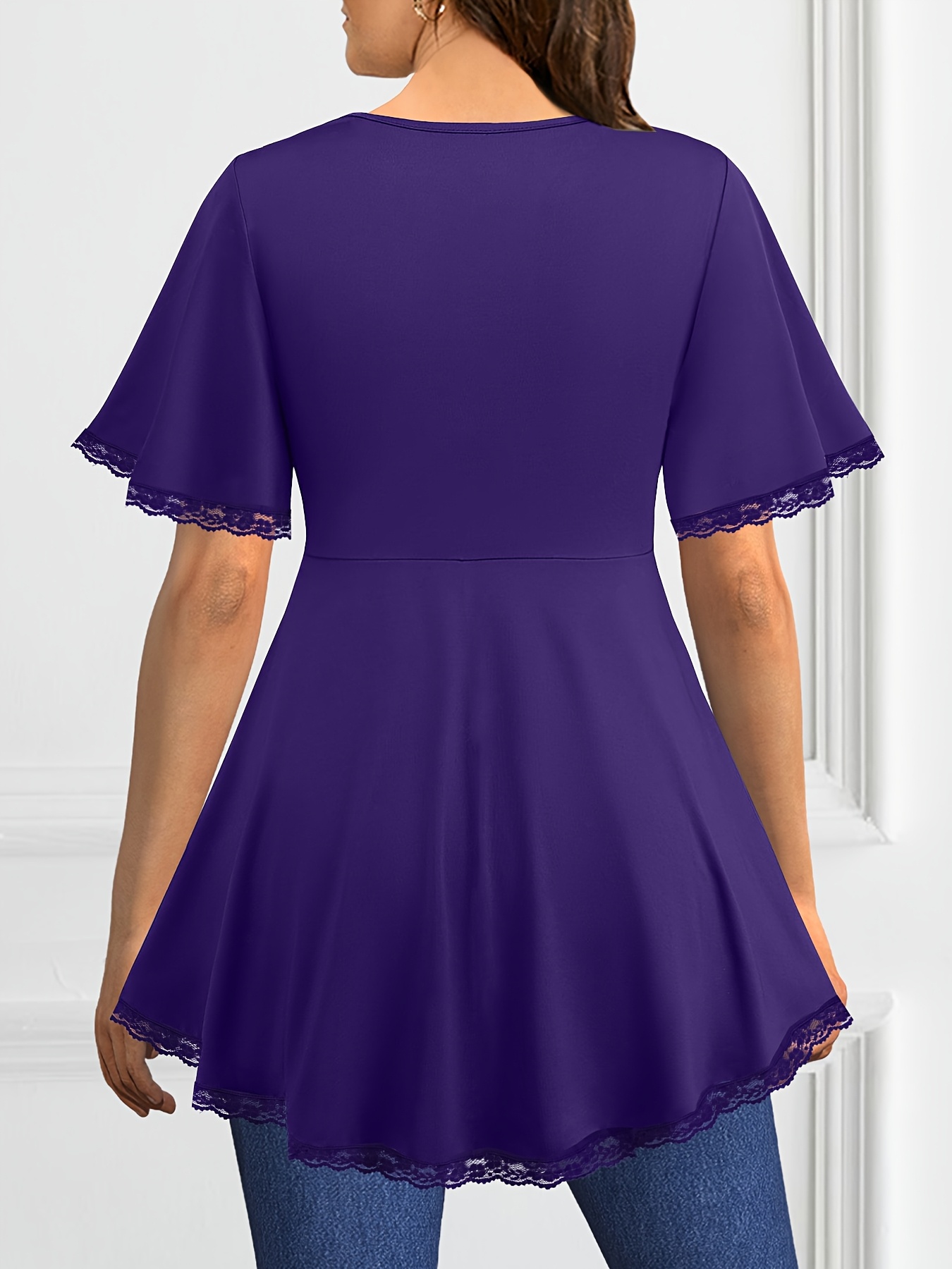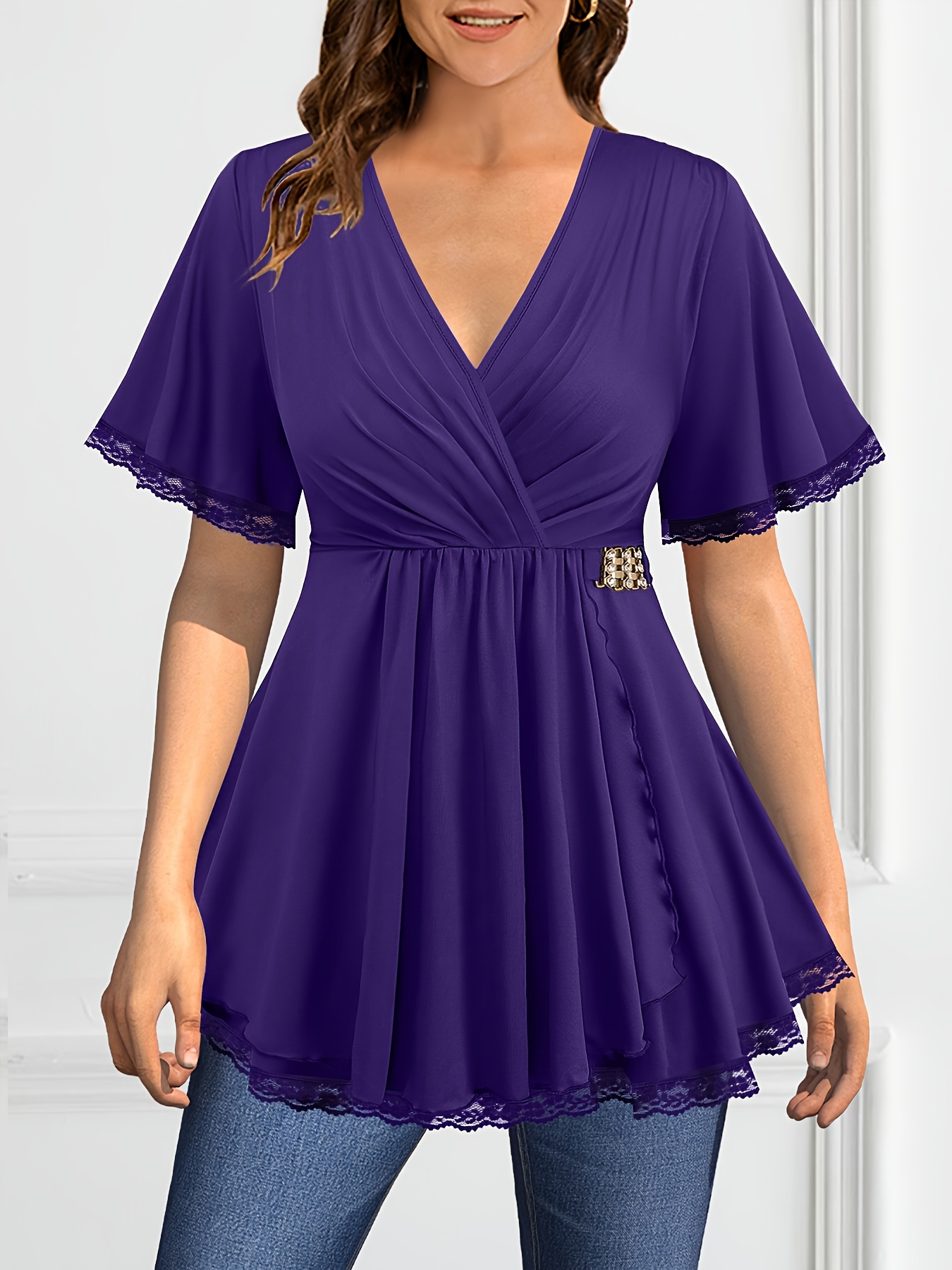 Plus Size, Plus Size Women's Elegant V-Neck Crossover Blouse with Lace Sleeves & Metallic Accents - Slim Fit Chic Top for Evening Outings, Machine Washable Spring/Summer/Fall Shirt, Formal Plus Size, Nontransparent Fabric, Party Wear, Breathable Material, Stylish Ladies