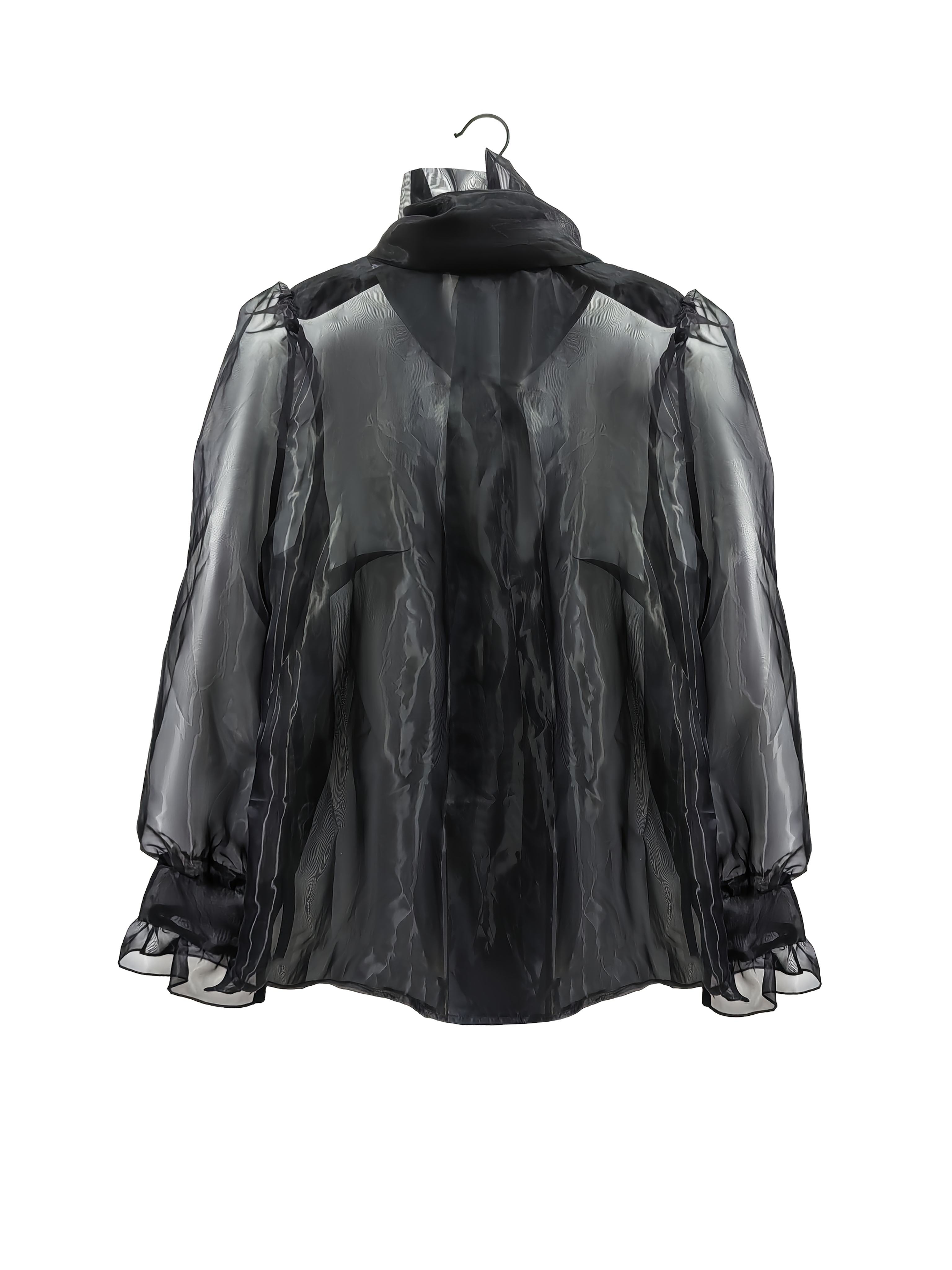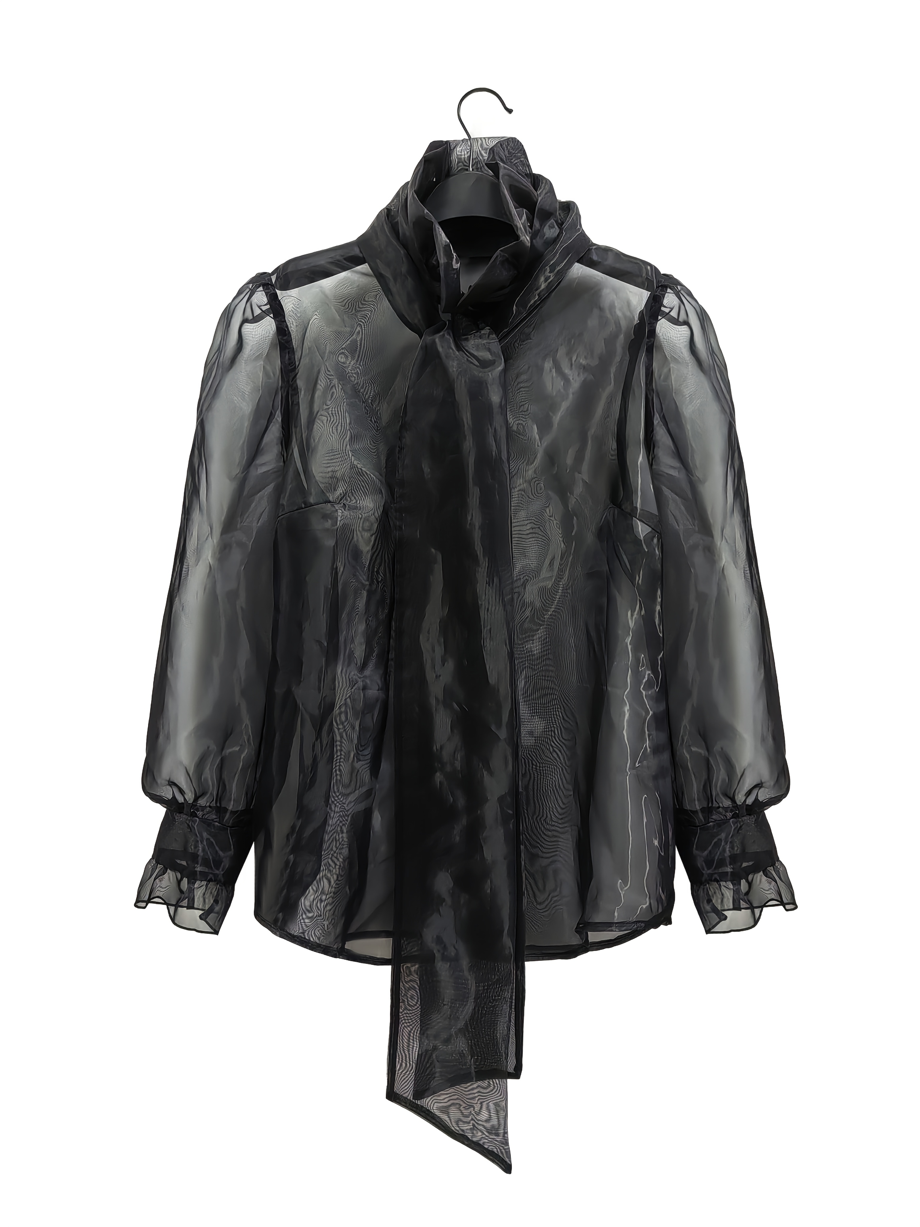 Plus Size Women's Elegant & Sexy Sheer Mesh Shirt with Bold Bow Detail - Choker Neck Long Sleeve Blouse, Semi-Transparent All-Season Top for Casual & Formal Wear, Formal Attire, Sophisticated Style, Nonstretch Fabric