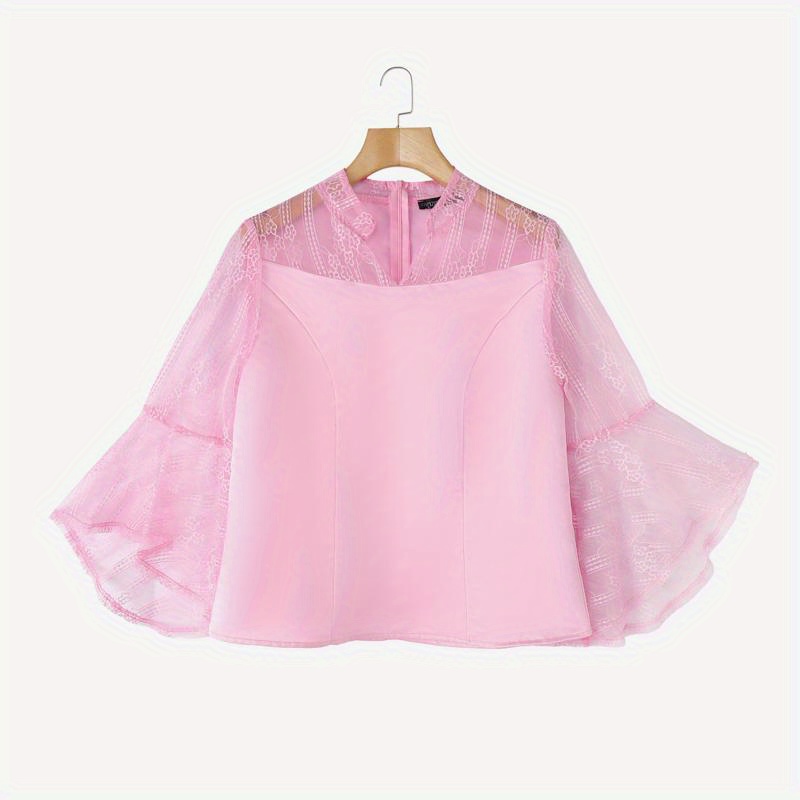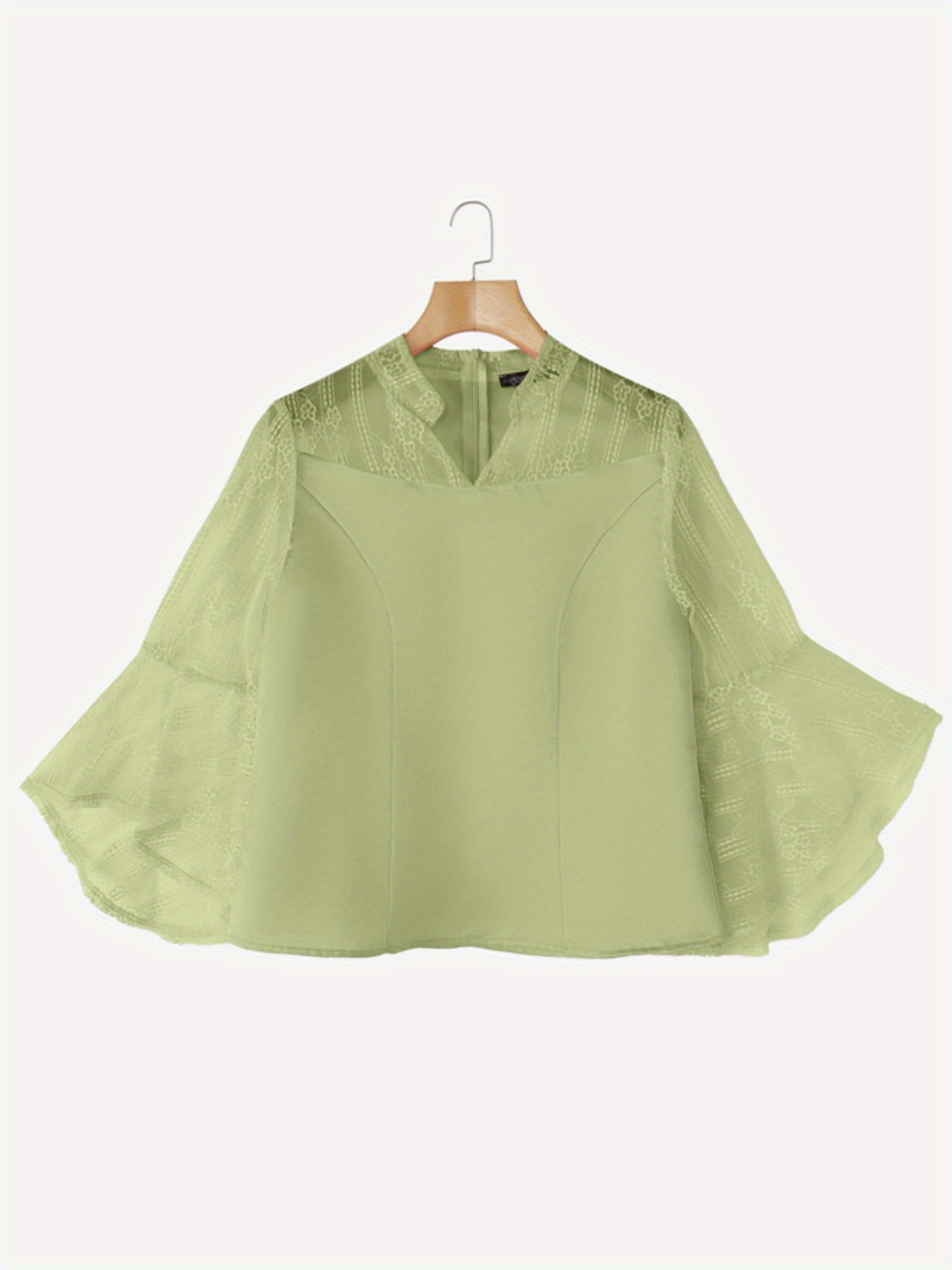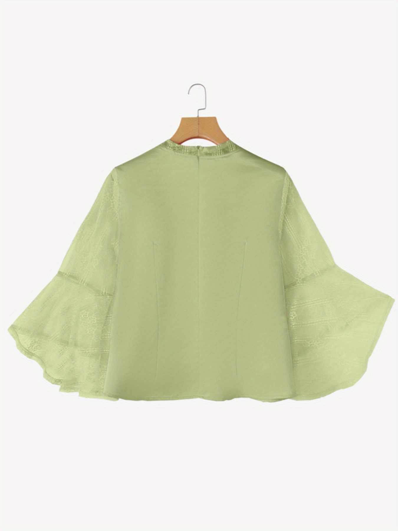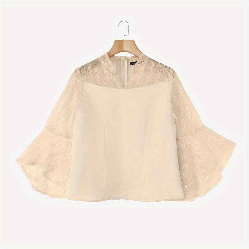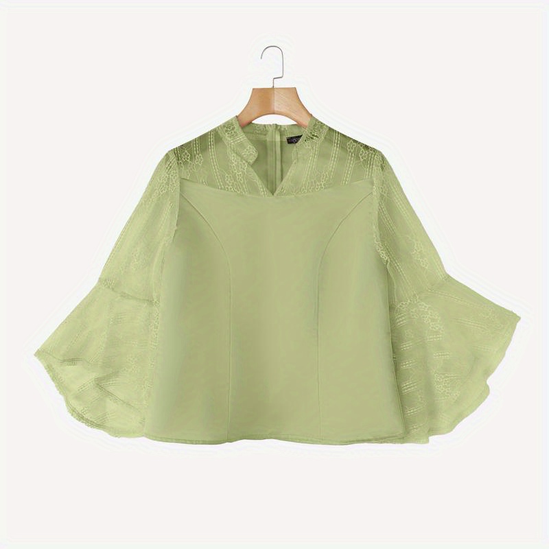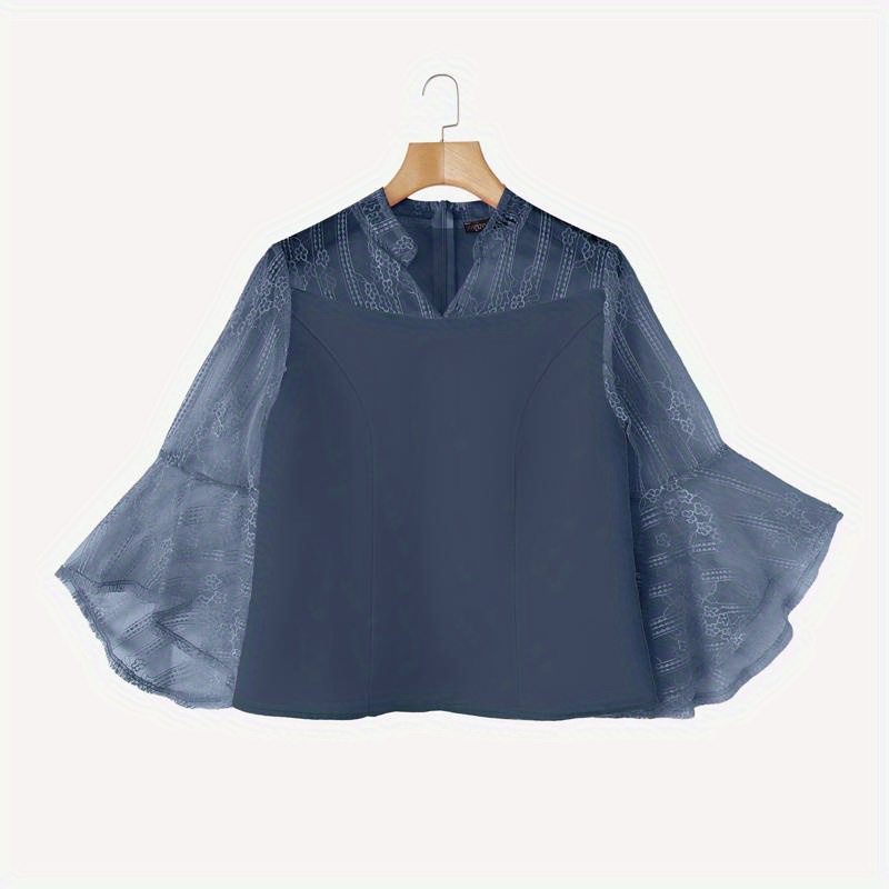 Plus Size - Women'S Elegant V-Neck Blouse with Sheer Mesh Lace Sleeves - Lightweight Loose Fit 3/4 Sleeve Top, Solid Color Casual Chic Shirt for Spring Summer Fall, Versatile for Casual & Formal Wear, Seasonal Fashion, Nontransparent Fabric