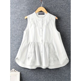 Plus Size, Women's Plus Size Vintage Blouse - Lightweight Elegant Shirt with Front Button Closure, Floral-like Patterns, Soft Pink/ Pastel color - Loose Fit Non-Stretch Blouse for Office, Formal Events, Casual Attire - Machine Washable Women's Tops, Summer Fashion, Mandarin Collar, Delicate Embroidery, Sleeveless Top, Fashion Lovers