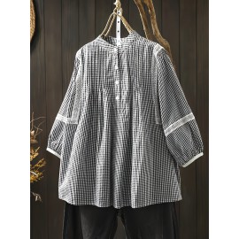 Plus Size, Women's Blouse - Elegant Black & White Grid Pattern Shirt with Rounded Neckline, Non-Stretch Fabric for Fall/Winter Everyday & Formal Outfits - Machine Washable Office Casual Blouse, Fall Fashion Top, Long Sleeve Top, Textured Fabric