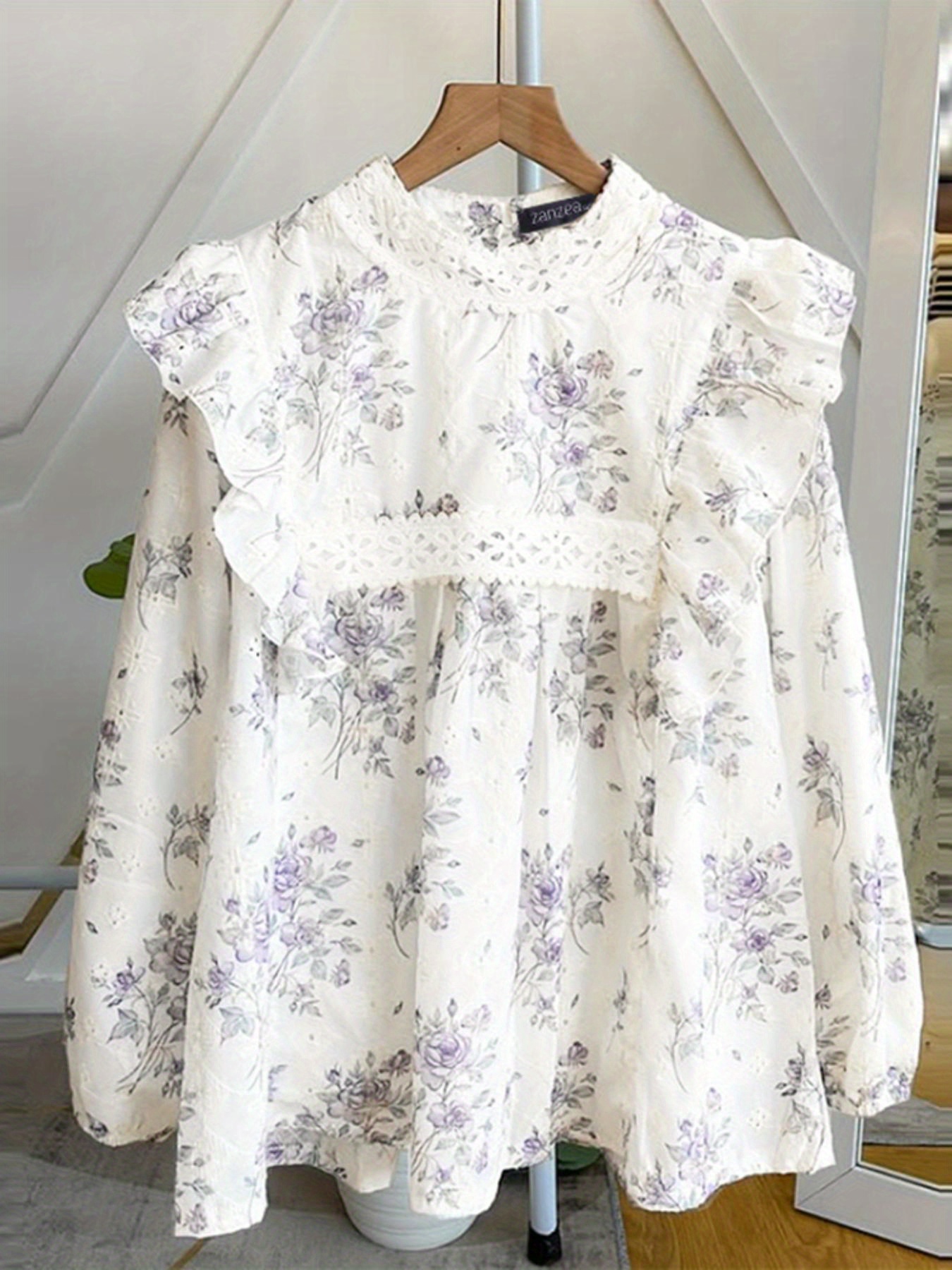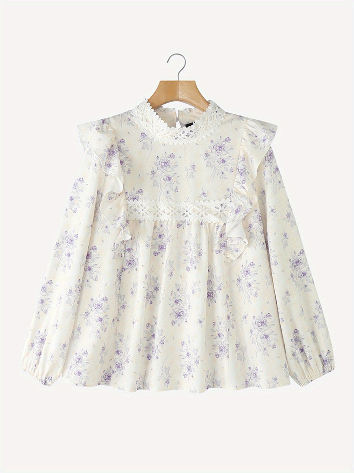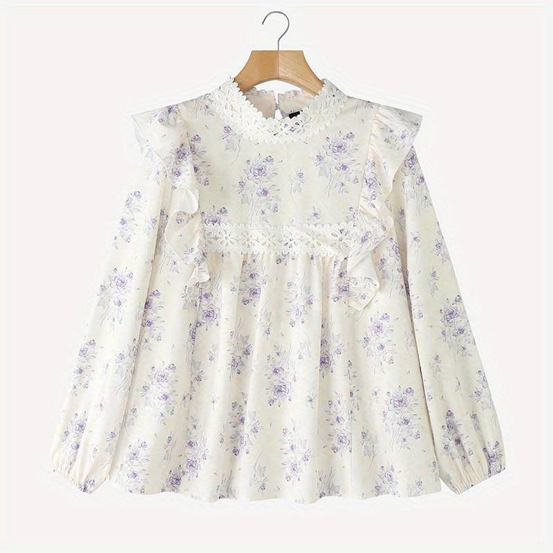 [Floral Lace Blouse] Plus Size, Women's Plus Size Blouse - Floral Lace Accent Shirt With Stand Collar - Lightweight Elegant Office & Party Top - Non-See-Through Formal & Casual Outfits - Machine Washable Women's Clothing By ZANZEA