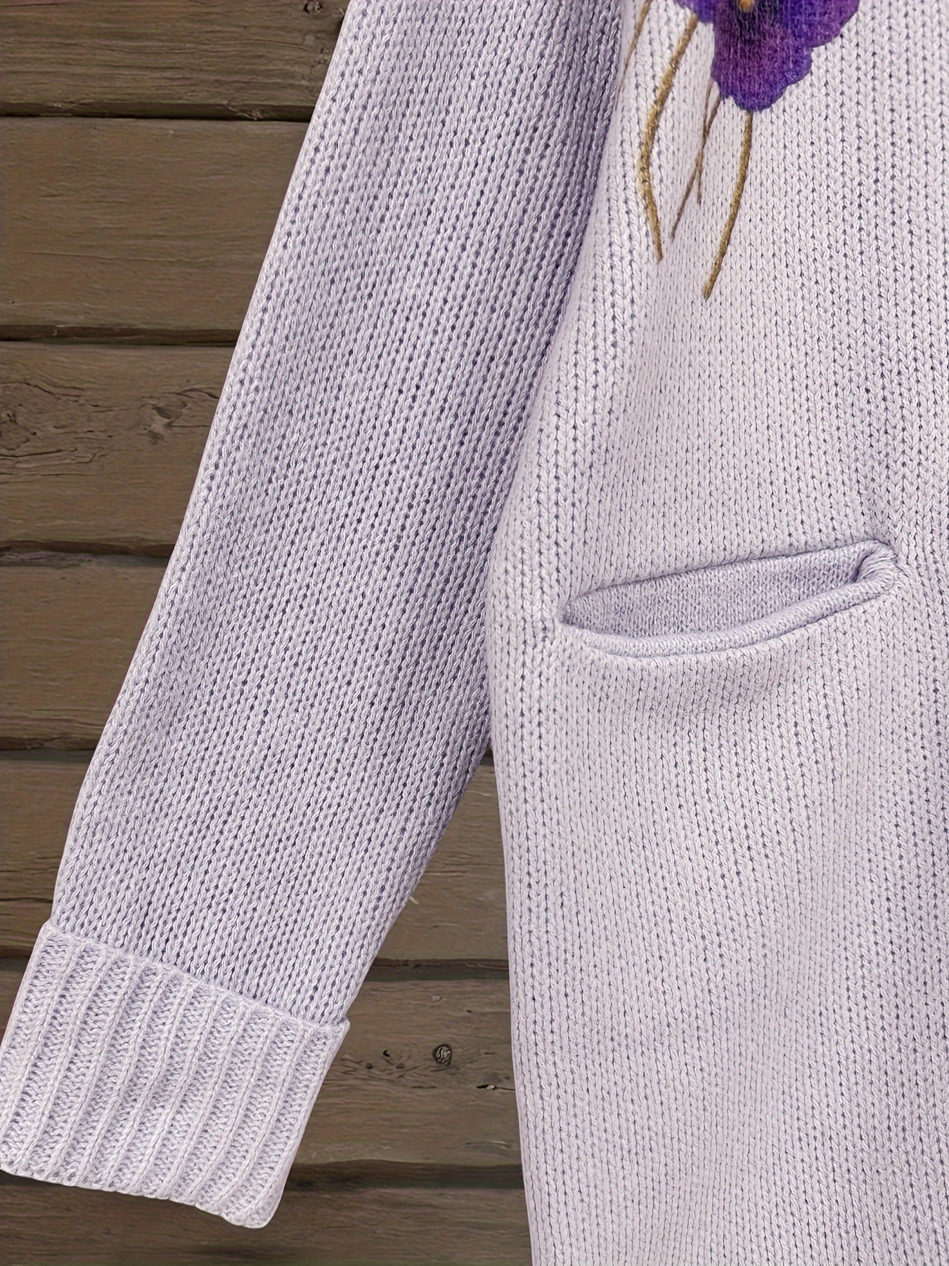 [Light Purple Hooded Sweater] European and American Retro Style Light Purple Hooded Thick Open Front Loose Long Sweater with Floral Print