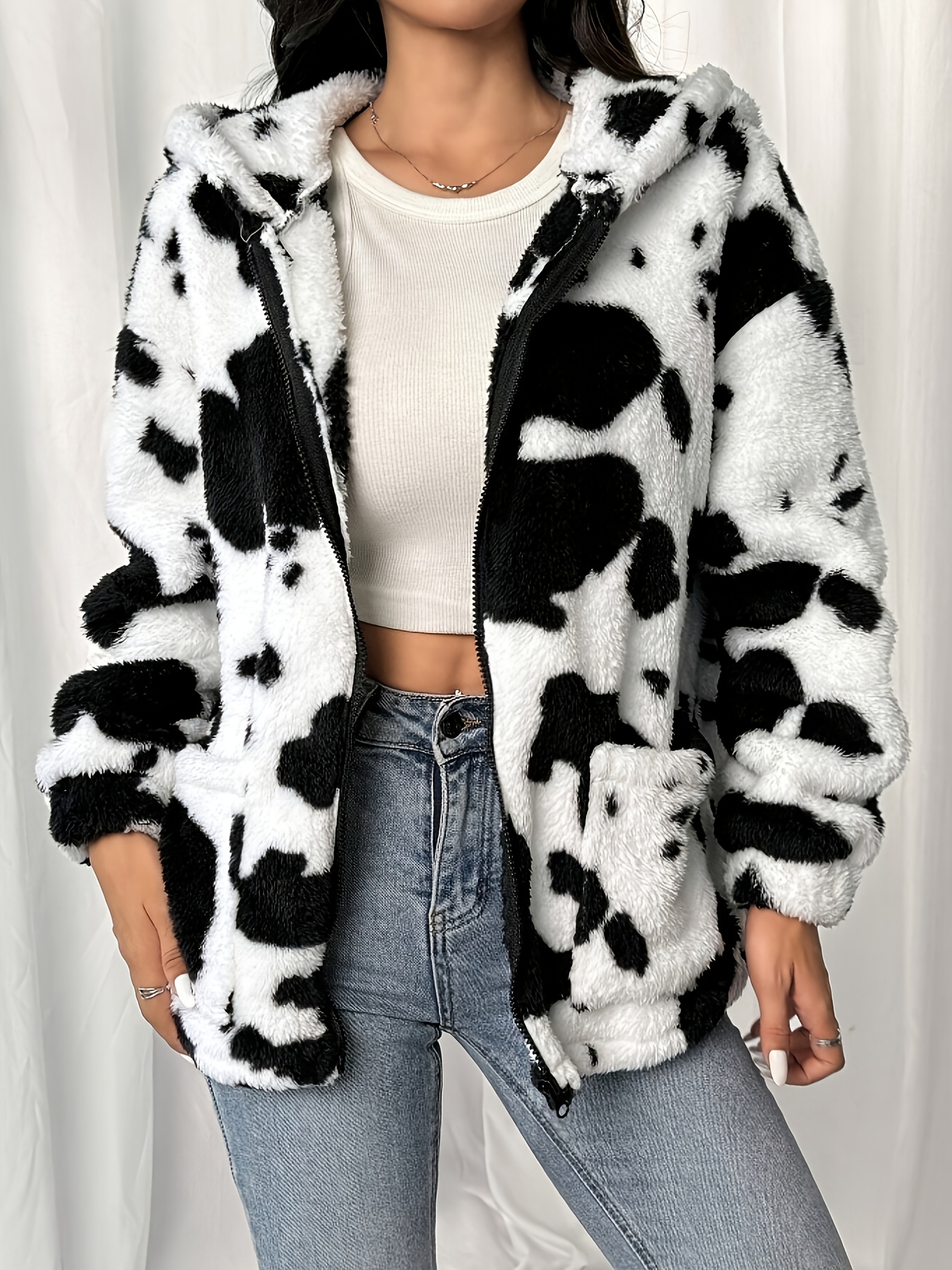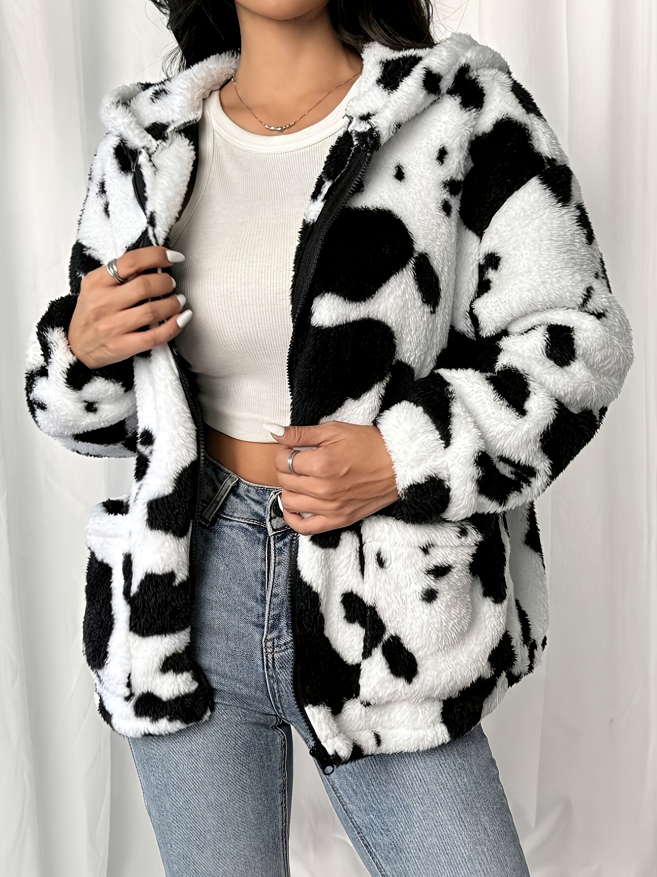 Plus-Size Women's Clothing | Cow Print Hooded Jacket | Black and White Printed Faux  Jacket with Pockets | Warm Autumn and Winter Jacket | Machine Washable | Elegant and Stylish Cow Print Jacket | Ideal for Casual Casual Attire