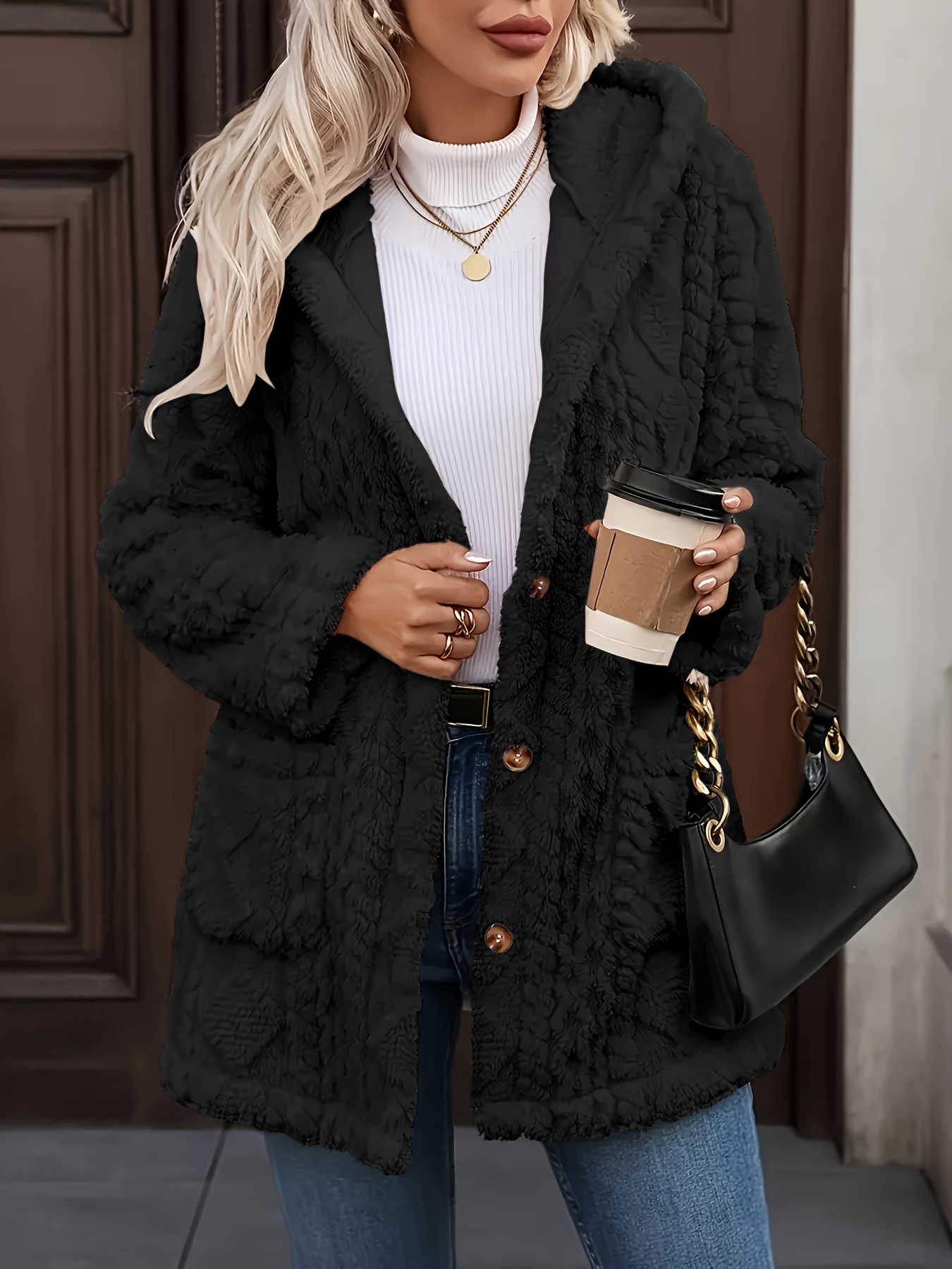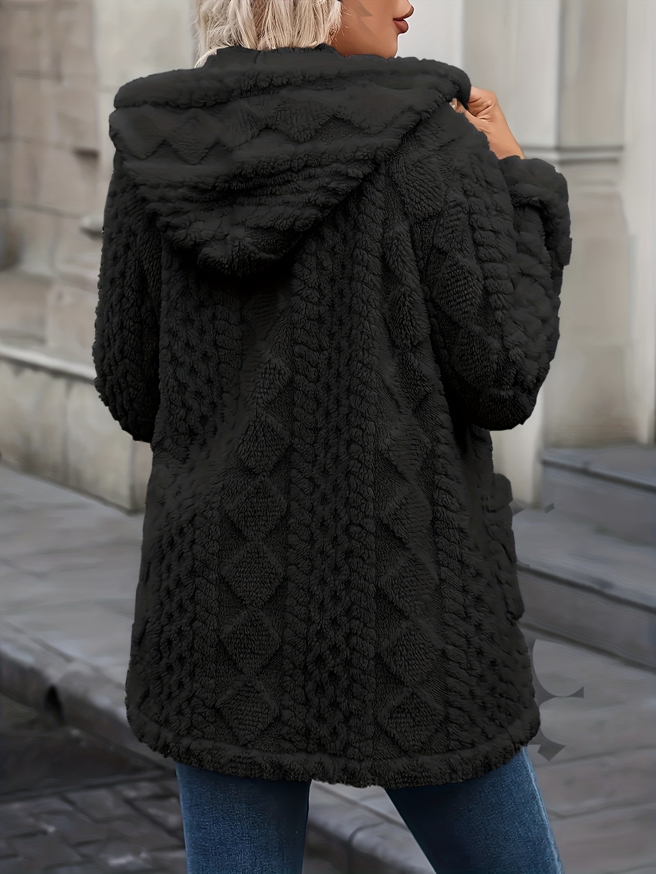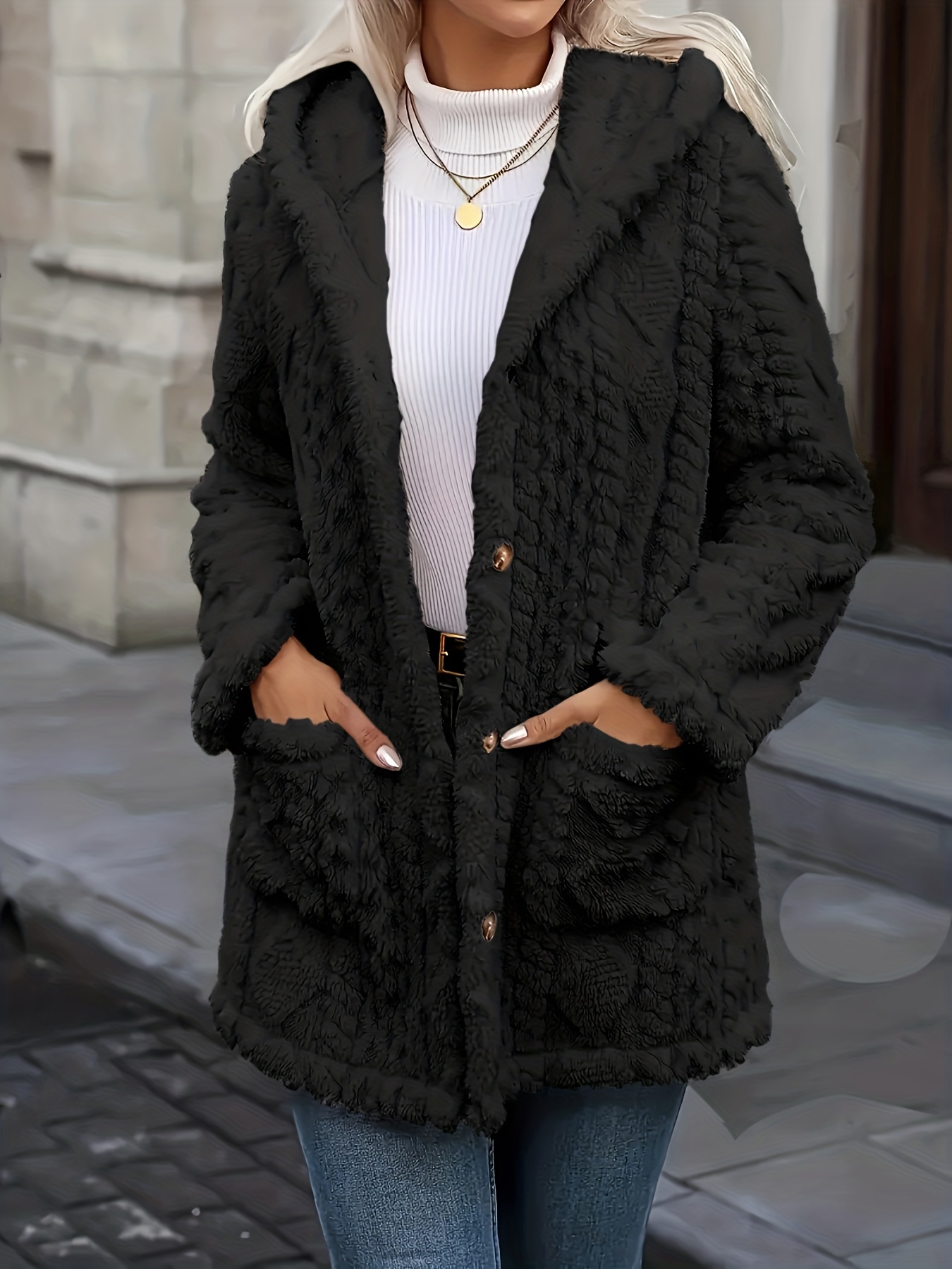 Plus Size, Women's Teddy Bear Plush Winter Coat - Elegant Hooded Jacket with Plush, Front Pockets & Button Closure, Beige/Black Mid-Length Outerwear for Fall/Winter, Machine Washable Cold Weather Blazer, Mature Style for Parties & Daily Wear