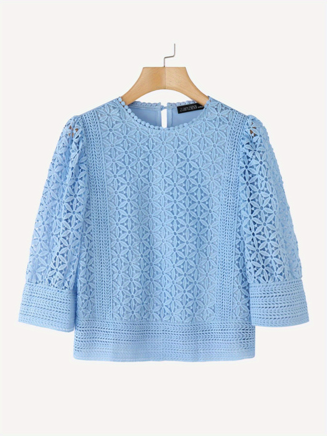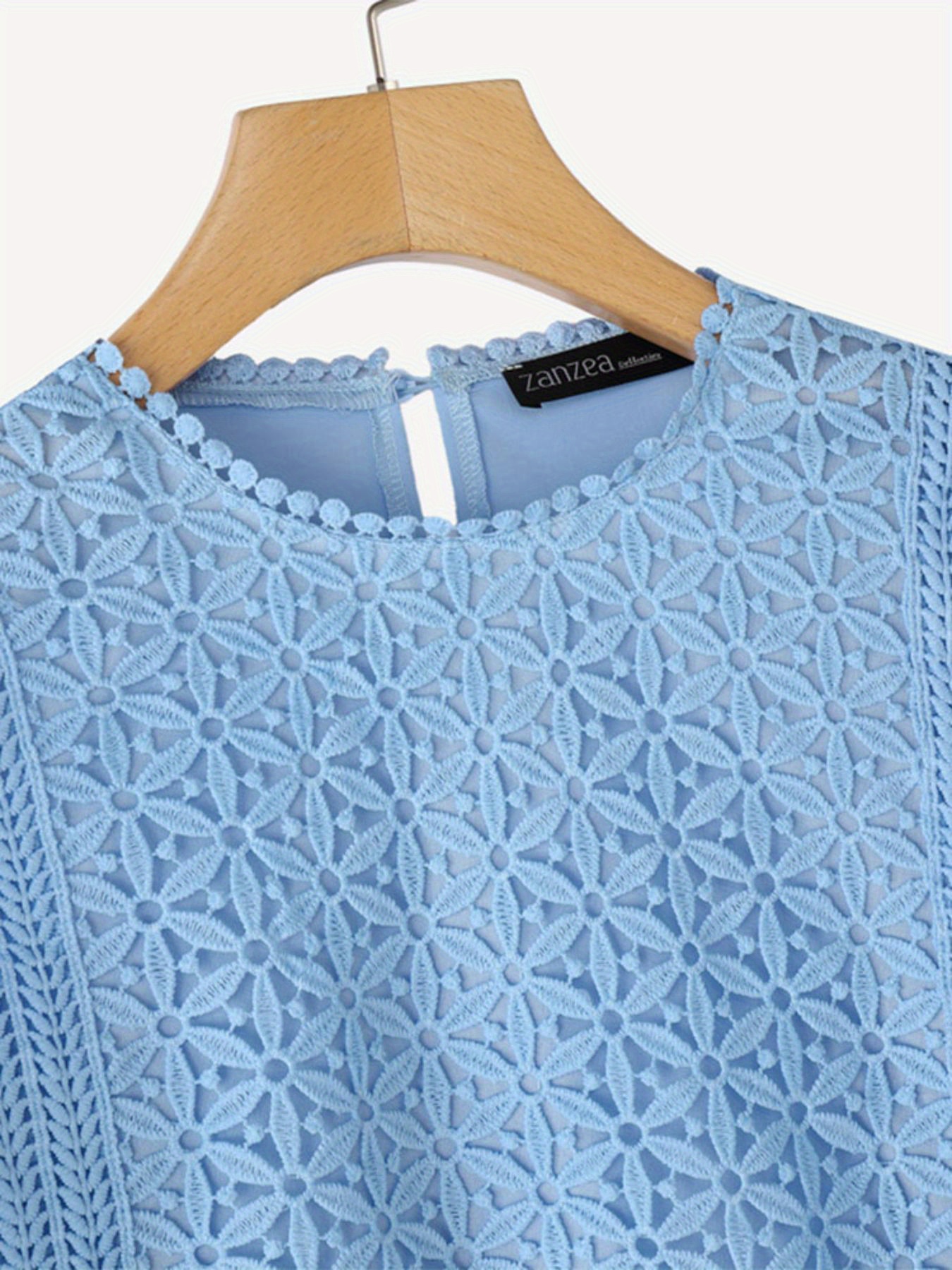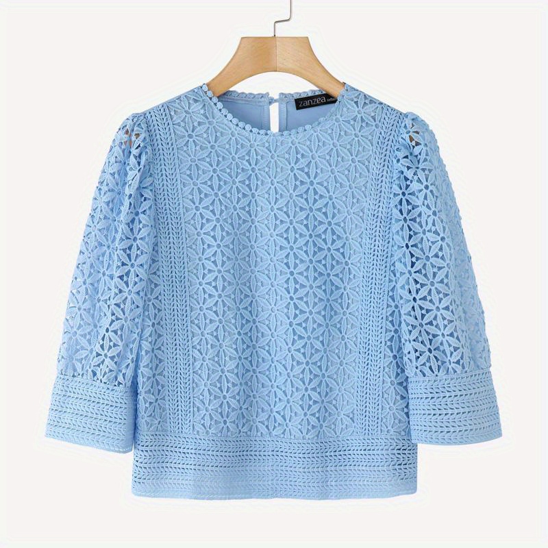 Plus Size, ZANZEA Women's Lace Patchwork Blouse - Semi-Sheer Short Sleeve Top with Round Neck, Soft Pastel Blue Summer Shirt, Machine Washable Elegant Casual & Formal Wear (Lightweight Layered Outfit Essential)
