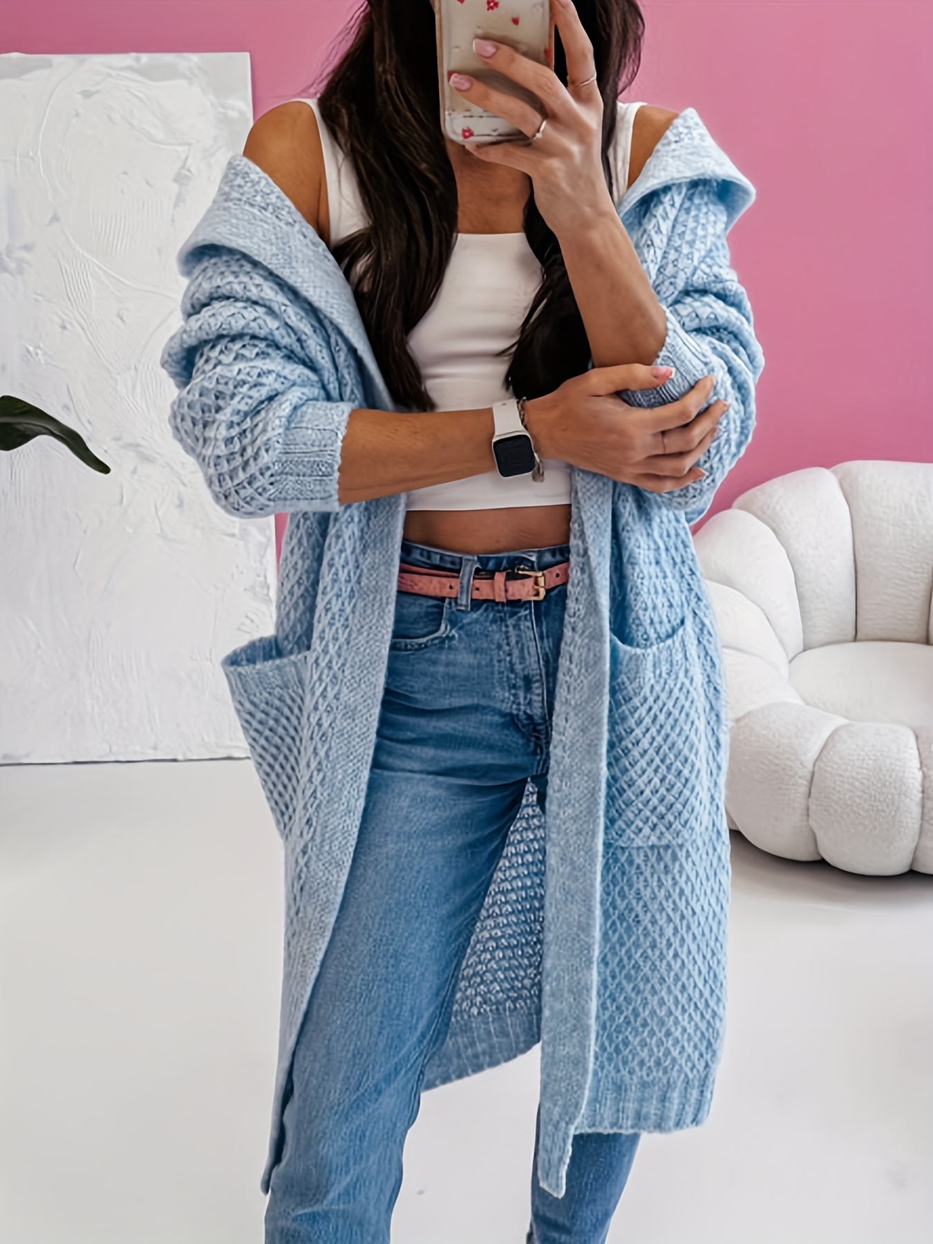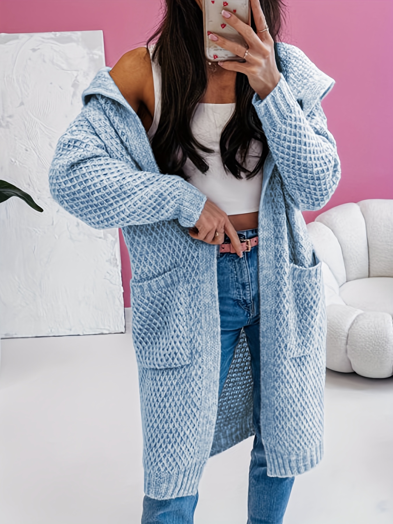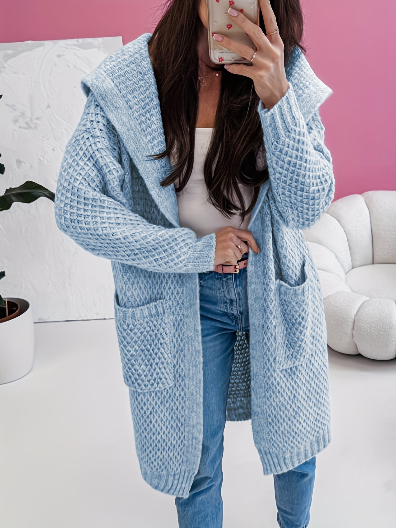 Solid Color Hooded Long Pocket Women's Cardigan - New Autumn/Winter Casual Loose Sweater Jacket