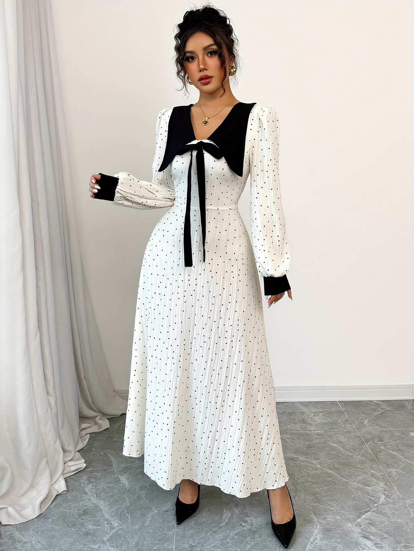 Women's Elegant Long Formal/Party/Office Dress - Flared A-Line Silhouette, Structured Non-Stretchy Fabric for Fall/Winter Events - Classic Women's Evening Gown, Elegant Evening Dresses, Formal Event Attire, Notched Collar Design, Decorative Bow Accent, Semitransparent Material