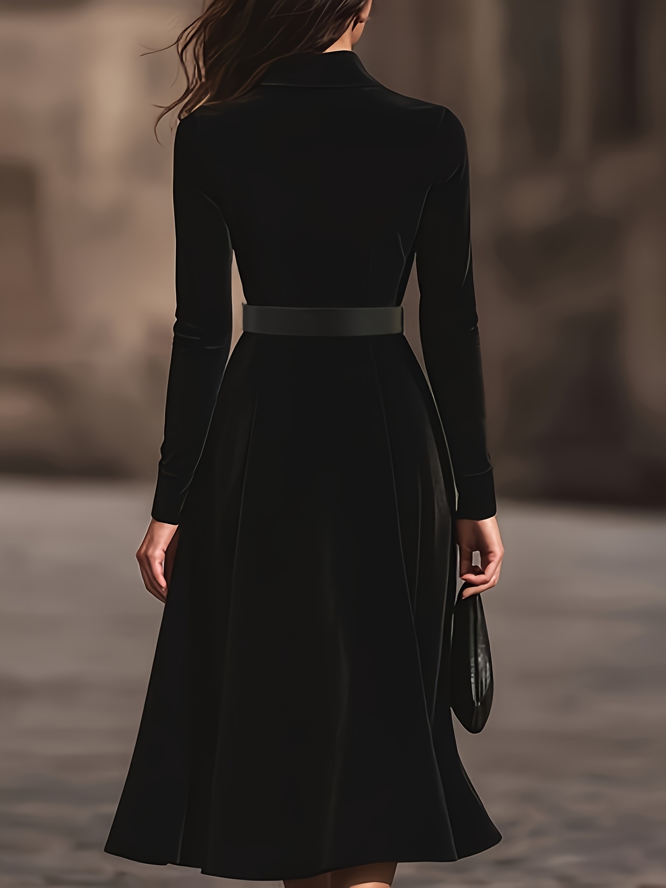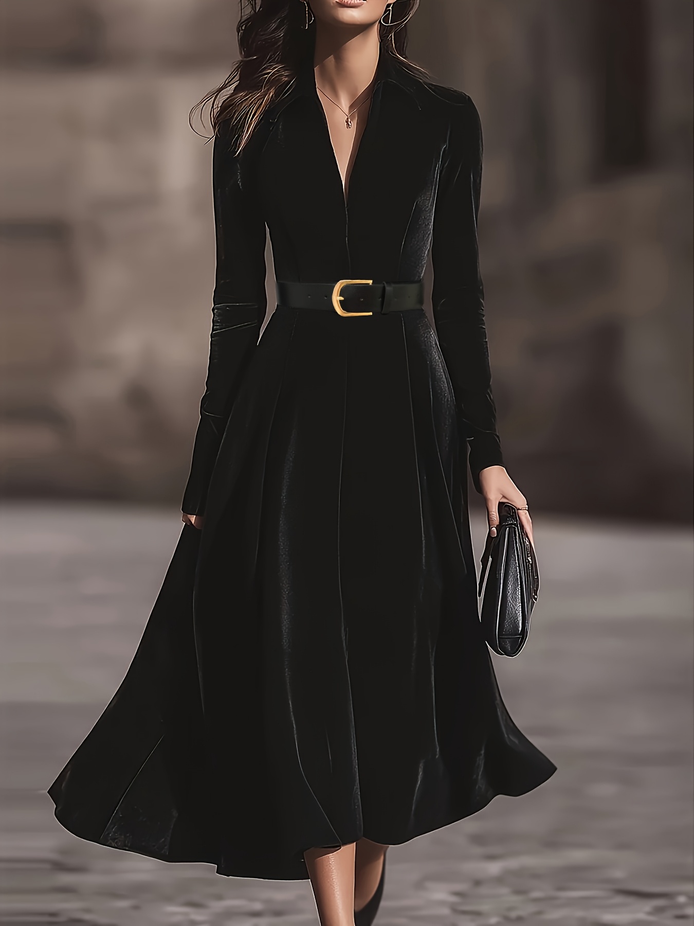 Women'S Elegant Vintage Black Velvet Maxi Dress with Deep V-Neck & Metallic Belt - Long Sleeve A-Line Floor-Length Formal Evening Gown for Fall/Winter, Sophisticated Party Wedding Attire, Winter Formal Wear, Sophisticated Style, Highquality Fabric