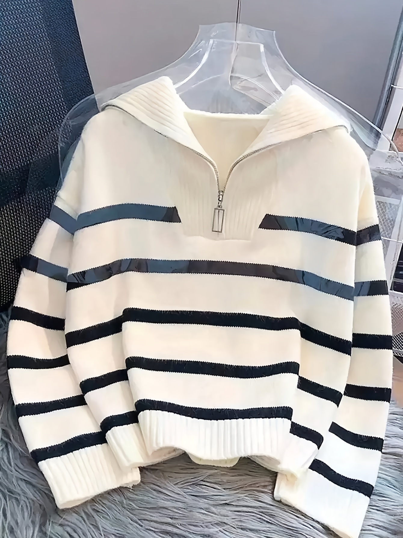 Women's Elegant White & Black Striped Winter Sweater - Thickened Long Sleeve Round Neck Zipper Collar Pullover, Soft Sweater for Fall & Winter, Casual to Formal Outfits, Machine Washable (/Beige/Gray/Black) - Versatile Layering Piece with Contrast Stripes, Medium Stretch Fabric, and Chic Zipper Detail for a Tailored Look, Cozy Sweaters for Women, Casual Long Sleeve Sweater, Womens Print Sweaters, Cardigan for Women Winter, Winter Top for Women, Sweaters for Women Office,