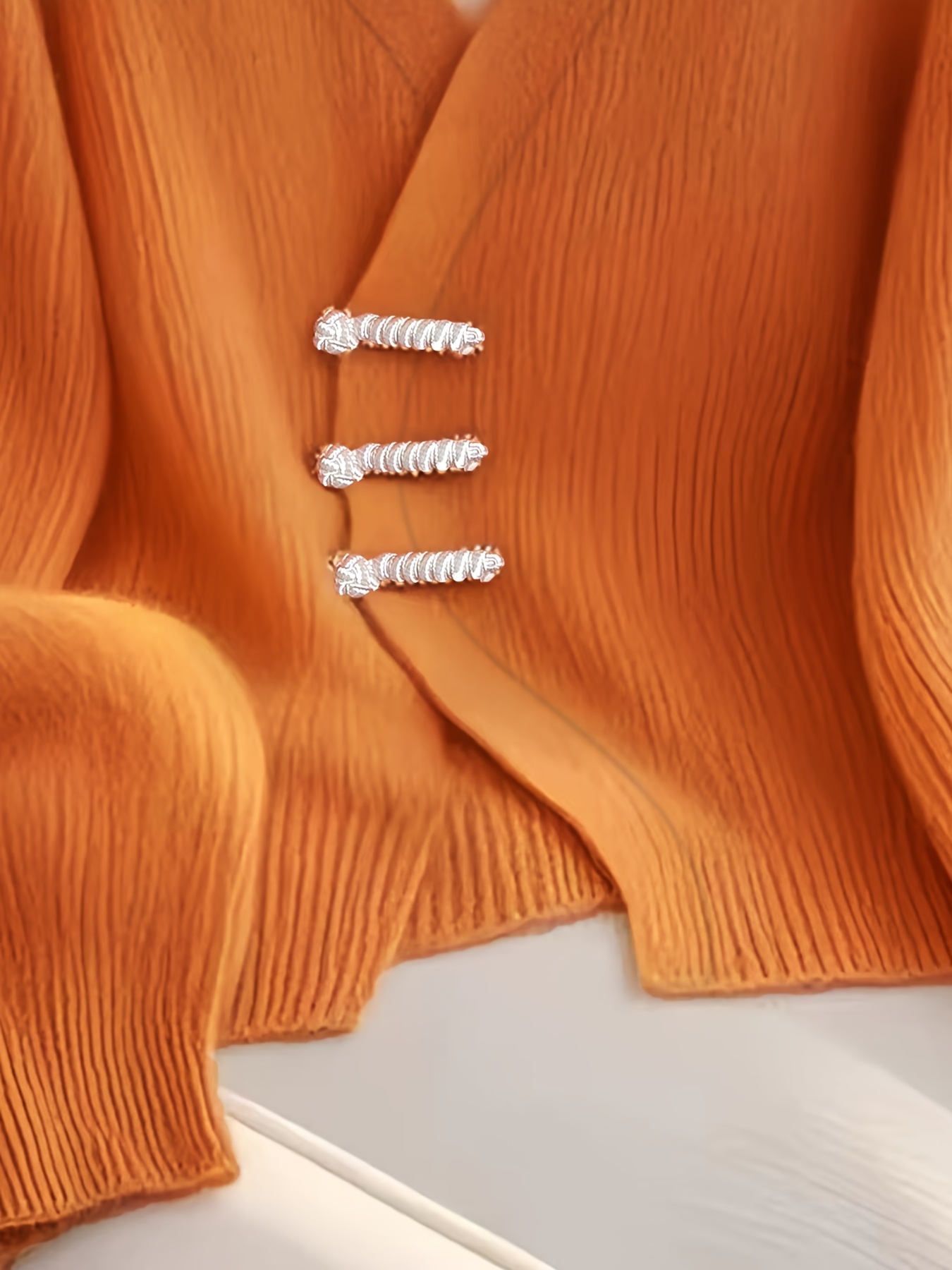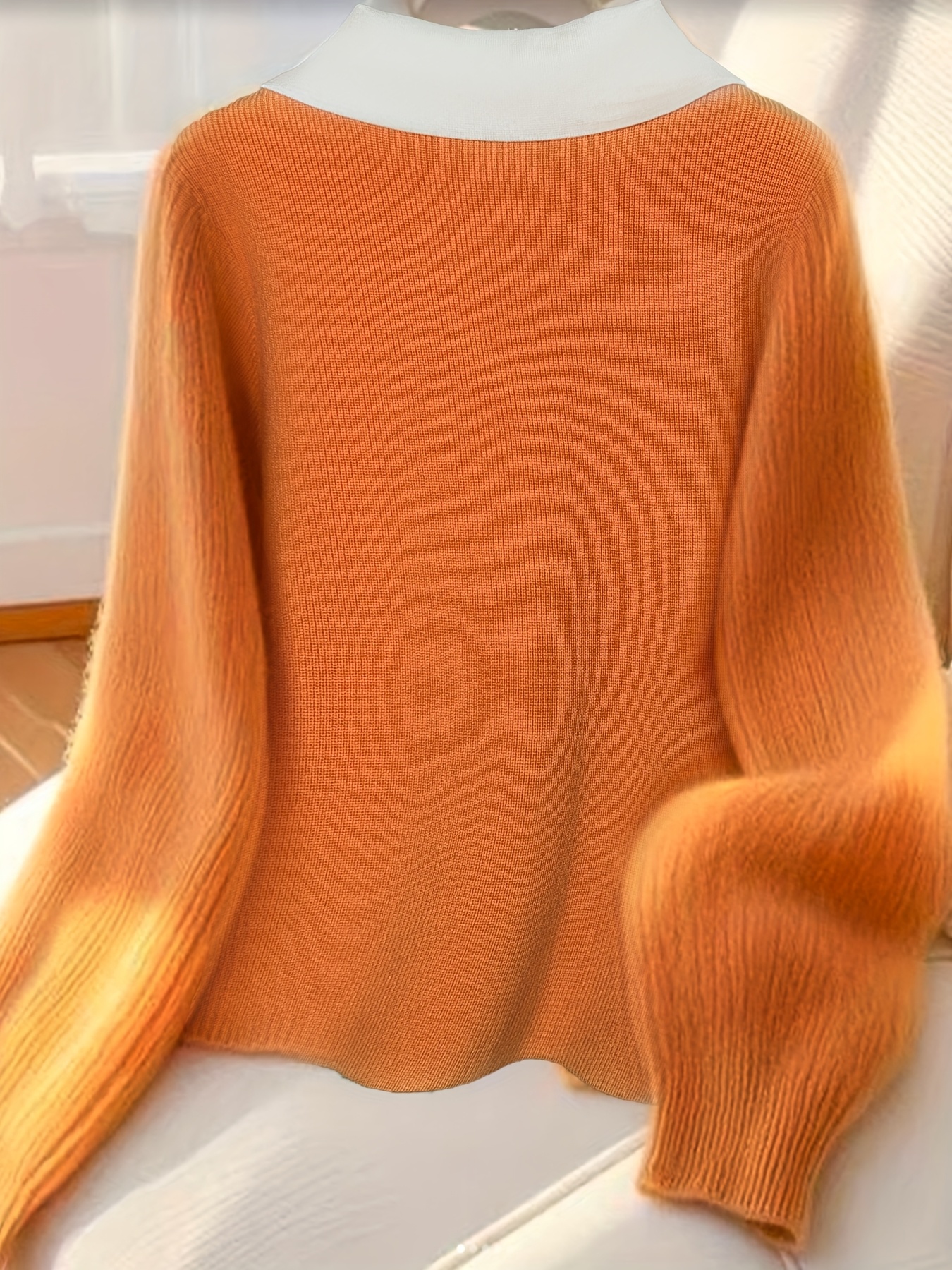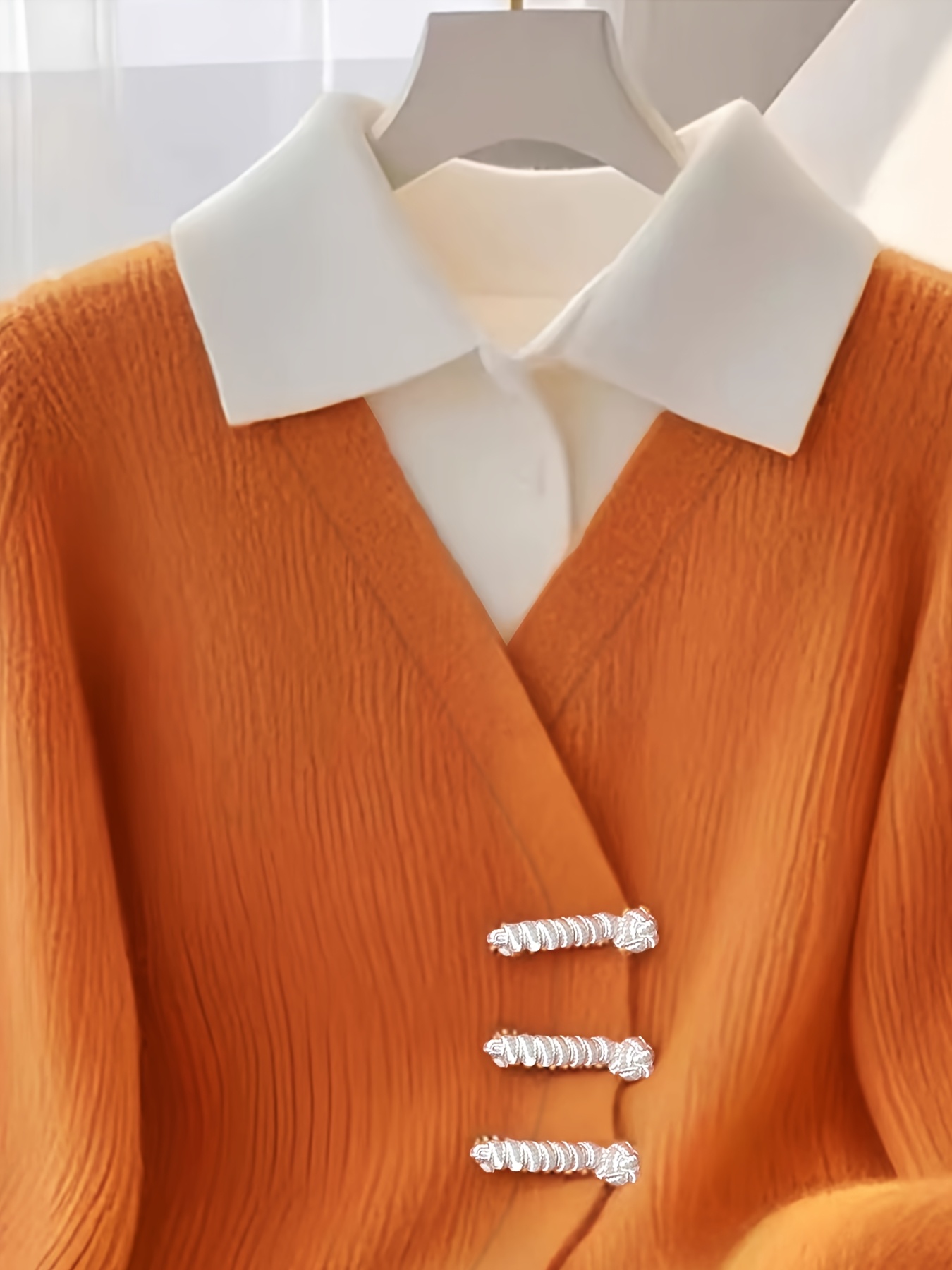 Women's Sweater with Collar - Elegant Fake Two-Piece design, Button-front placket, Machine Washable Sweater for Fall/Winter, Office Party Outfits - Warm Orange Sweater for Women