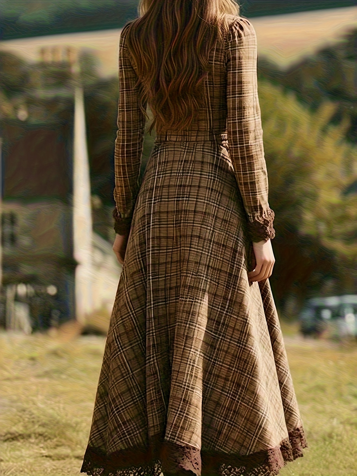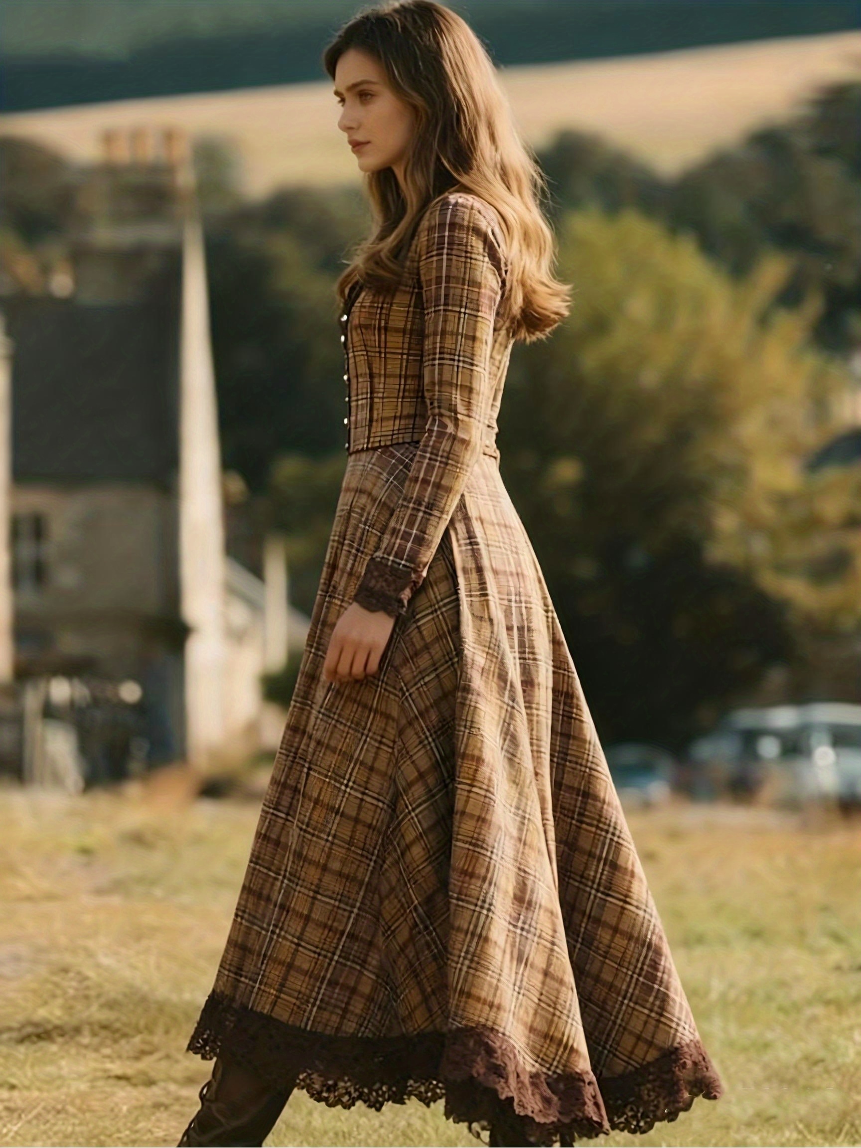 Women'S Vintage V-Neck Dress - Elegant Brown & Checkered Long Formal & Everyday Dress with Waist-Cinching Belt, Non-Stretch Fabric, Flared Hem for Office, Party, Wedding Outfits - Fall/Winter/Summer Dresses, Cute Dress